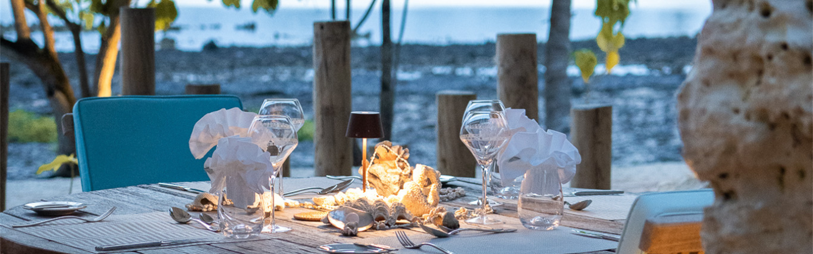 In an atmosphere of effortless elegance, the cuisine celebrates freshly caught fish from the lagoon of Tikehau, prepared with precision and simplicity. Between golden sand, warm island light, and tables tucked discreetly among the rocks, the experience unfolds like a rare and timeless escape.