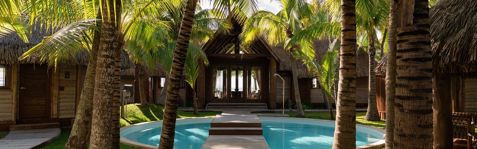 1,256 m² of private beachfront open up: circular garden and pool, seventy coconut palms filtering the Pacific light, petrified wood totems standing before the lagoon in an almost sacred stillness. The 170 m² interior living space is dressed in rare Marumaru wood, timber from the century-old trees that once lined the harbour of Papeete, and welcomes bespoke furniture, a library, bar and lounge. A home one never wishes to leave.